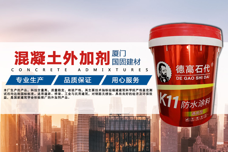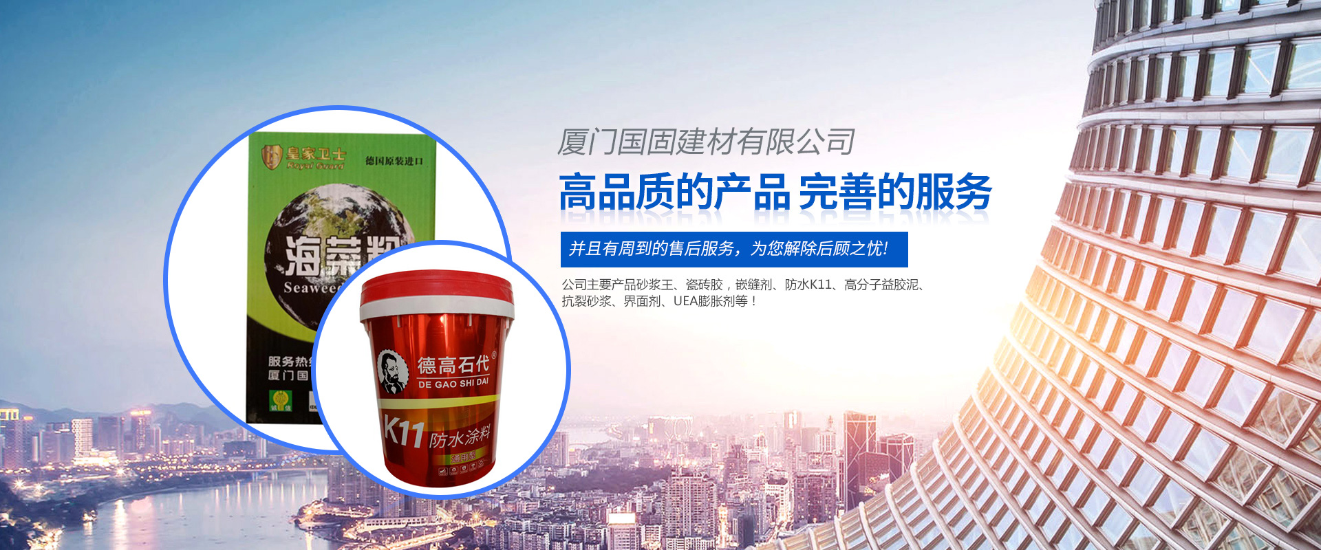 ??廈門國固建材有限公司是集科研開發,生產為一體的混凝土外加劑科技生產單位,公司技術力量雄厚,工藝科學先進,產品質量及性能在全國同行業中。并且有周到的售后服務,為您解除后顧之憂。本廠生產的產品,科技含量高,質量穩定,檢驗嚴格,其主要技術指標經福建建筑科學院嚴格鑒定測試后均達到國標標準。是目前水泥制品中理想的名加劑產品,適用道路、橋梁、工業與民用建筑,對鋼筋無繡蝕、具有良好的經濟及環保效益,是國家建筑學會積極推廣的外加劑產品。本廠推廣標準化,規范化、程序化管理、具有健全、完善、持續穩定運行的質量保證體系。產品遠銷上海、江蘇、浙江、廣州、北京、江西、安徽、福建等地,在大批國家建設工程中應用效果良好,并以性能優越、質量可靠、以及良好的售后服務在市場上享有很高的信譽。本廠在今后的歷程中,將一如既往的為您提供高質量、高科技的產品,完善的服務以感謝廣大客戶的支持和厚愛?!翱萍紕撔?、以誠為本,用戶滿意”是我公司發展的永恒目標,我們堅持“以誠結情、質量取勝”,以高品質的產品回報社會?!坝每婆d建材,創優品工程”,期待與各界朋友與時俱進,努力開拓進取,力求為用戶提供“高品質的產品,完善的服務”。公司愿與設計部門、建設單位、施工企業及同行們攜手合作,共創未來,共鑄輝煌、公司主要產品砂漿王、瓷磚膠,嵌縫劑、防水K11、高分子益膠泥、抗裂砂漿、界面劑、UEA膨脹劑等!